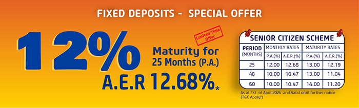 You can now open Fixed Deposits with UB Finance PLC with a minimum of Rs. 25,000/-. UB Finance offer you a secure and reliable way to rapidly grow your savings. Our Fixed Deposits ensure that you receive the best returns for your investments, with attractive interest rates and convenient maturity periods to suit your individual requirements.
